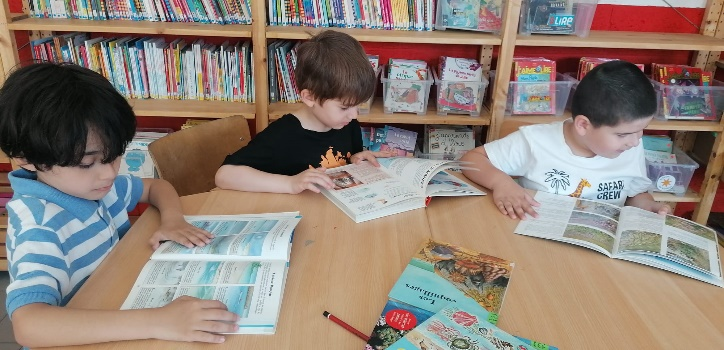 « On a cherché des livres pour apprendre des choses dans la bibliothèque de l’école, ça s’appelle des documentaires. On a su que les livres parlaient de la mer car dessus il y a des étiquettes avec des vagues ». Masal (M3 mauve)